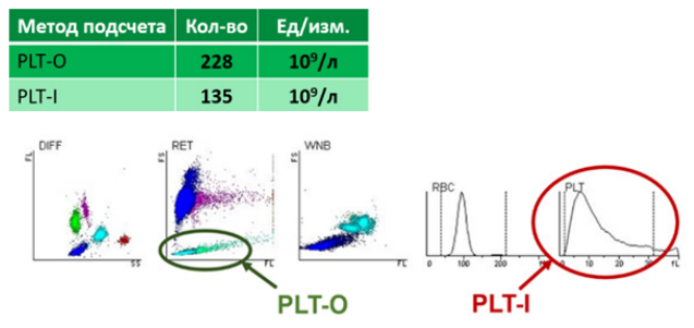 В Клинике имени профессора Ю.Н. Касаткина данная проблема решена. Помимо стандартного апертуро-импедансного метода (PLT-I) в клинической лаборатории используется дополнительный метод подсчета тромбоцитов (PLT-O). Особенностью метода PLT‑O является использование метокфлюорохромов, а также дополнительных дезагрегирующих веществ в ретикулоцитарном канале гематологического анализатора. Так, под наше наблюдение попал пациент, в крови которого при первичном подсчете количество тромбоцитов составило 135*109/л (ниже референсных значений). При микроскопии мазка крови обнаружено большое количество агрегатов тромбоцитов, что потребовало повторного подсчета. При повторном подсчете с использованием метода PLT‑O количество тромбоцитов составило 228*109/л, что было сопоставимо с ручным подсчетом (259*109/л).