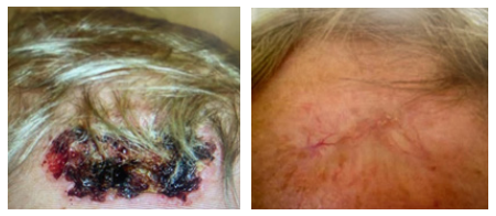 Пациент П. 74 года. ДО и ПОСЛЕ курса радикальной коротко-дистанционной рентгенотерапии базальноклеточного рака кожи лба IV ст. с первичным очагом более 5 см в диаметре (через 6 месяцев – полный регресс опухоли)